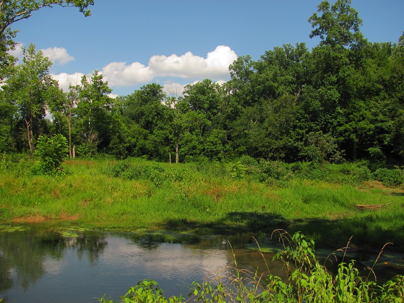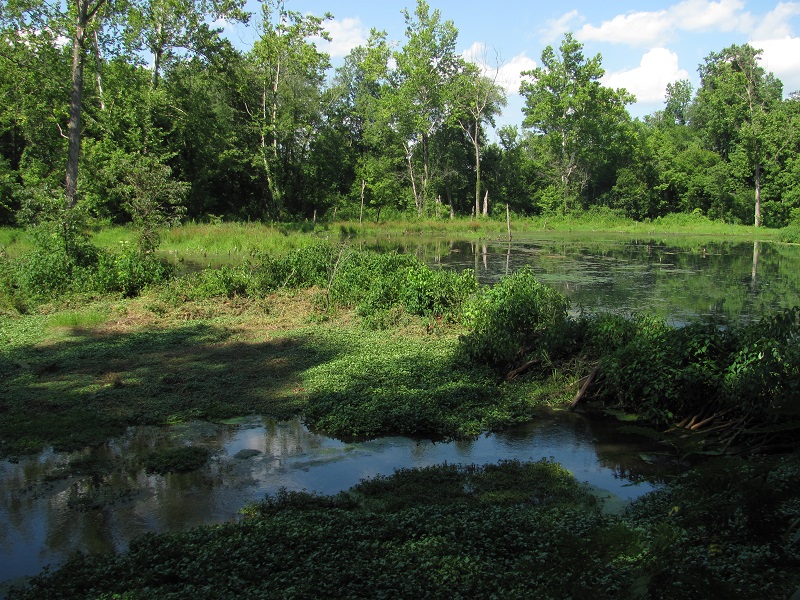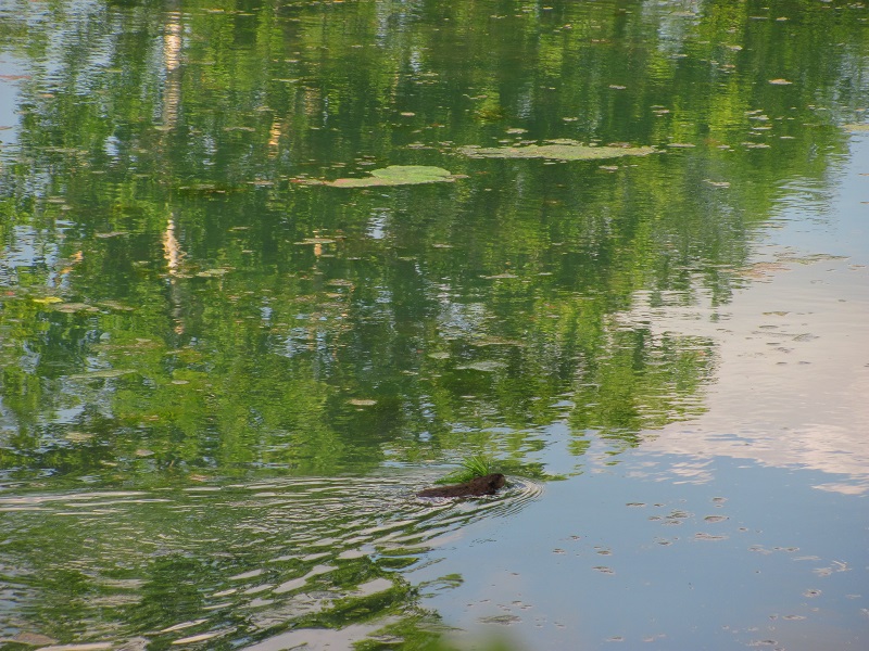 Photo of the beaver dam (left). A beaver working on the dam (right):
